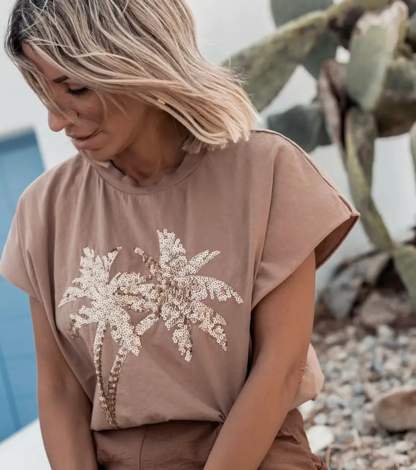 Κάμελ βαμβακερή μπλούζα με σχέδιο φοίνικα από παγιέτα